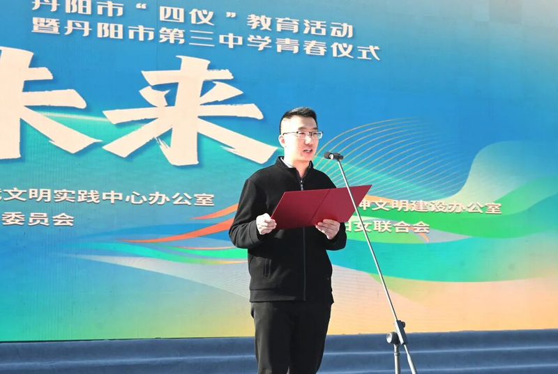 青春仪式在庄严的国歌声中正式拉开帷幕。丹阳市委宣传部副部长、文明办主任毛骧翔致辞,勉励学生传承五四精神,厚植家国情怀。