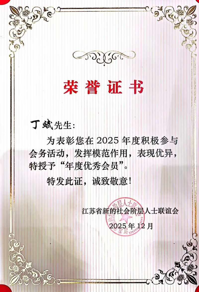 | 12月12日,江苏省新的社会阶层人士联谊会二届三次理事会(扩大)会议在南京召开。省委统战部副部长徐东海出席会议并作重要讲话,省新联会会长班子全体成员、各分会和专委会负责人及部分会员代表共120余人参加会议。 会议表彰了一批积极履职、贡献突出的优秀会员。其中,省新联会社会服务委员会副主任、镇江市新联会社会服务委员会主任、江苏万善律师事务所主任丁斌律师,凭借在公益慈善与社会服务领域的突出贡献,荣获“年度优秀会员”称号,成为镇江市唯一获此殊荣的会员。
