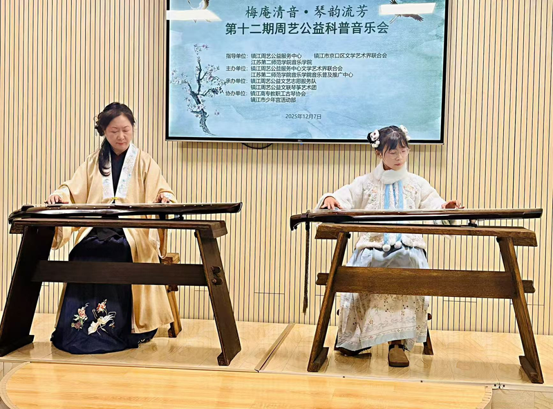 2025年,是李洁老师正式退休后的第一年,她却比以往更加忙碌。身份虽变,但她作为一名教育工作者和文化传承者的使命感愈加强烈。年初,她即受聘于京口区团委“京小青·青年夜校”,开设《古琴文化鉴赏》课程,为都市青年打开一扇了解传统文化、静心修身的大门。在镇江高专,她继续心系校园,不仅在工会活动中心开设教师古琴研习课程,更悉心指导“镇江高专教职工古琴协会”,让悠扬琴韵陶冶教职工身心,丰富校园文化生活。 从青少年到在职教师,李老师的教学对象广泛。暑假期间,她带领少年宫梅庵少儿古琴社的孩子们,走进市残疾人托管中心,在“童梦助残 温暖同行”公益活动中,以一曲齐奏《梅花三弄》传递温暖与关爱。她还为正东路街道的“非遗传承公益暑托服务”提供为期28天的沉浸式古琴体验课,在孩子们心中种下传统文化的种子。 情系桑梓 公益讲坛播清音 李洁老师的公益足迹,深深印刻在服务社会、传播文化的道路上。她积极参与各类文化惠民活动:6月,她带队参加“乐龄杯2025老年文艺展演”镇江直播演出,展现银龄风采;7月,她走进江苏大学,为“亲情中华·中国寻根之旅”镇江营的华裔青少年们举办古琴讲座,架起文化交流的桥梁;国庆假期后,她为镇江市老年大学古琴班进行公益授课,用琴声陪伴老年朋友乐享生活。 她的奉献精神也体现在对民盟组织的深厚情感中。今年1月,她参加了民盟高专支部与周艺公益联合主办的慰问老盟员活动,现场介绍古琴历史,以雅乐表达敬意。她还参与了“镇江非遗诗词吟诵研究中心”的揭牌等重要文化活动,并出席中国古琴专委会理事会及文化惠民周,不断汲取新知,拓展交流。