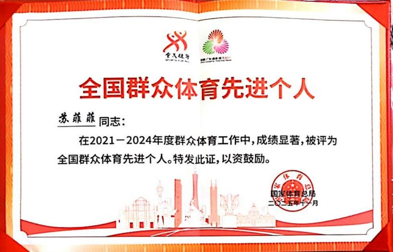 这些沉甸甸的奖牌和证书,不仅是苏老师专业指导能力的生动体现,更是镇江高专体育育人成果的精彩展示。 荣誉加身,群众体育践初心 由于在推动校园体育和群众体育活动方面的突出贡献,苏菲菲老师被国家体育总局授予“全国群众体育先进个人”荣誉称号。这一国家级荣誉,是对她多年来致力于普及体育活动、增强学生体质、弘扬体育精神所付出努力的最高褒奖,彰显了她作为一名体育教育工作者的初心与担当。