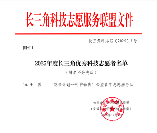 公益领航 “花朵计划”护童真 “从小养成刷牙习惯,一生乐享健康生活”,这是王茜深耕公益的初心。2016年,一份显示超60%儿童存在龋齿问题的体检报告,让她萌生守护儿童口腔健康的公益想法,随即牵头组建由资深口腔医生组成的“花朵计划——呵护幼齿”公益青年志愿服务队,正式开启护齿公益征程。九年间,她创新“小小牙医”沉浸式体验模式,把诊室化作趣味十足的“牙齿王国”,还联合民盟丹阳市中医院支部开展公益活动,通过角色扮演、互动教学让巴氏刷牙法等专业知识浅显易懂 。该计划累计深入全市三十多家幼托所和中小学,开展200余场活动,惠及3000余名儿童;她还打造“线上+线下”立体化宣传矩阵,开发护齿绘本、线上家长课堂,培训幼儿园“护齿辅导员”,设立“花朵基金”,构建全方位儿童口腔健康防护网。此项目入选镇江首批十条科普研学路线,斩获江苏省优秀青年志愿服务项目、江苏省优秀科普研学课程等多项省级荣誉,丹阳现代口腔也被认定为镇江市科普教育基地,个人也荣获2025年度长三角优秀科技志愿者。