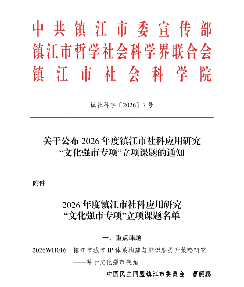 | 2月24日,2026年度镇江市社科应用研究“文化强市专项”立项名单正式公布。本次评选竞争激烈,全市共征集申报课题193项,最终40项获批立项,其中重点课题16项。由民盟镇江市委会理论研究会副会长曹照鹏博士主持的《镇江市城市IP体系构建与辨识度提升策略研究——基于文化强市视角》凭借扎实的研究基础和较强的创新性,成功入选重点课题立项。