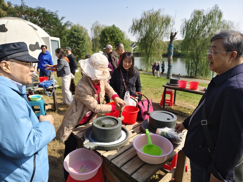 随后,老盟员们参观了生态养殖区,详细了解农场的养殖模式。部分老盟员还体验了传统石磨豆浆制作工艺,在推磨研磨中感受传统农耕文化魅力,进一步加深了对农村传统生产生活方式的认知。