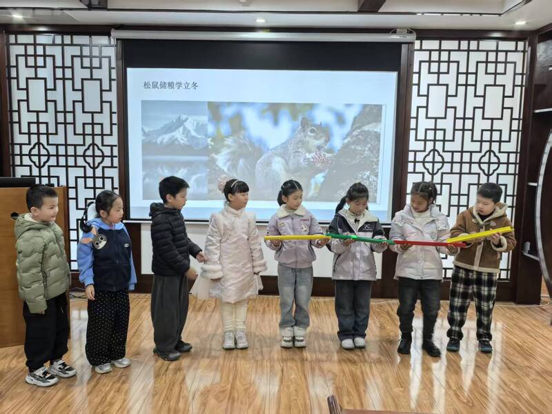 为持续弘扬中华优秀传统文化,引领青少年感知自然节律与古老智慧的魅力,11月23日,民盟句容支部成功举办“盟友开讲”系列活动之“奇妙的冬季节气”传统文化体验课。盟员韩利老师再次登上句容市图书馆国学讲坛,带领孩子们开启了一场沉浸式的冬日文化探索。 活动伊始,韩利老师以“松鼠忙存粮”的趣味互动游戏,瞬间点燃了现场气氛。孩子们在欢声笑语中模仿小松鼠忙碌储备食物的情景,直观地感受到“立冬”节气万物收藏、准备过冬的物候特点,理解了立冬作为冬季起始的意义。