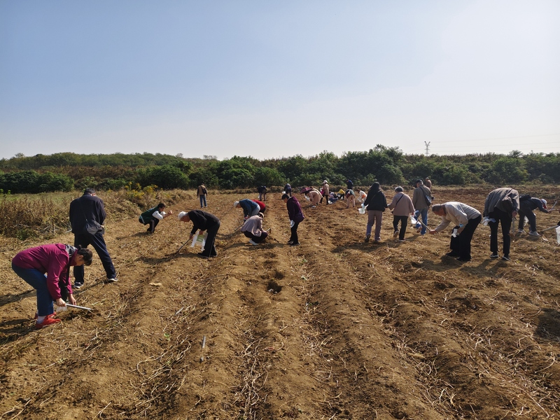 在红薯种植区,老盟员们兴致盎然地参与了采挖体验。大家挥锹翻土寻找红薯,丰收的喜悦洋溢在每个人脸上,现场气氛热烈融洽。