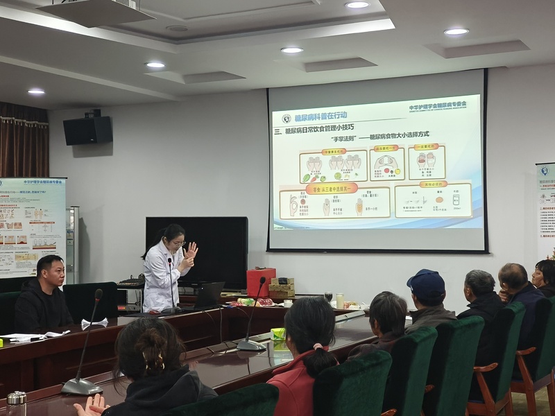 活动中,句容市人民医院内分泌科主任陈继芳以权威文献数据为切入点,系统解读糖尿病高发病率现状,强调此类疾病对居民健康的潜在影响,呼吁职场人群及相关风险群体提高重视。糖尿病专科护士王文君借助食物模型,生动演示“食物交换份”法的应用,通过“拳头、手掌”等生活化估算方式,将抽象的饮食原则转化为具体可操作的技巧,着重强调均衡膳食、定时定量的饮食核心要点,提升了科普教育的实用性和接受度。