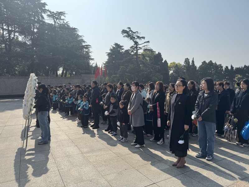在镇江市烈士陵园,盟员们身着深色服装,手持小白花,整齐列队,神情肃穆地肃立于纪念碑前。全体盟员肃立默哀,深切悼念为民族解放事业、人民幸福生活英勇献身的革命先烈,缅怀他们不畏牺牲、奋勇拼搏的崇高精神。默哀毕,民盟润州支部主委朱莉带领全体盟员向烈士纪念碑敬献花圈,仔细整理缎带,表达对英烈们的深切缅怀与崇高敬意。